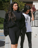 Kim Kardashian was spotted out and about with her sister Kourtney in LA on Wednesday. The pair headed to a low-key lunch at Hugo's Restaurant and stuck together in coordinating black and white looks. It's been a pretty eventful week for Kim, to say the least. After she shared a nude selfie on Instagram on Monday, all hell basically broke loose on the Internet; she received criticism from fellow celebrities like Chloë Grace Moretz, Bette Midler, and Piers Morgan, and even more famous women (including Miley Cyrus, Demi Lovato, and Kim's one-time frenemy Amber Rose) came out in defense of her racy snap via social media.